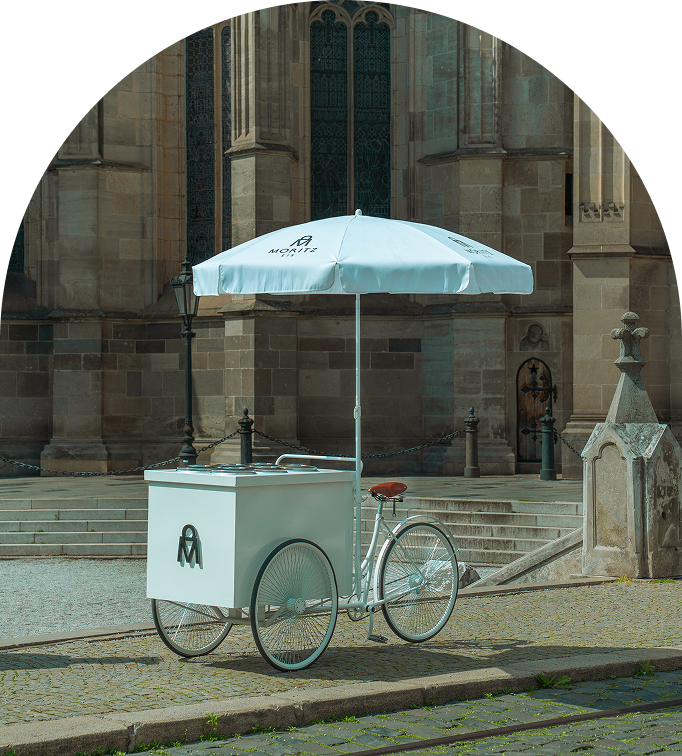 Štýlový zmrzlinový bicykel s chladeným boxom. Kapacita až X litrov zmrzliny, možnosť ponúknuť až 6 rôznych príchutí.